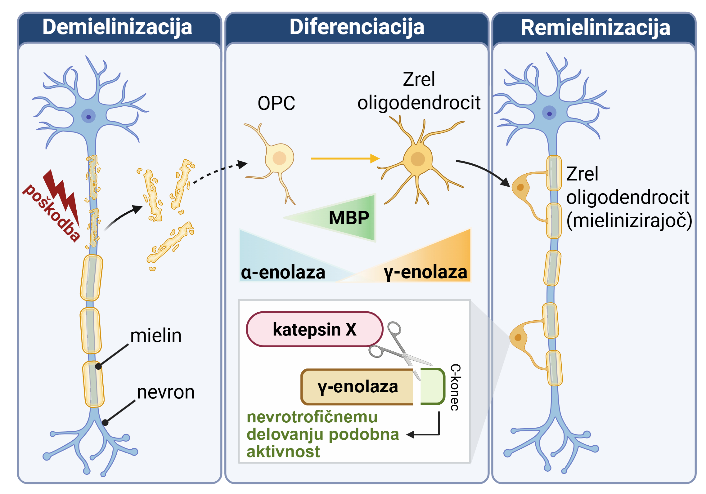 Multipla skleroza je kronična vnetna bolezen osrednjega živčevja, za katero je značilna izguba mielina. Pri tej bolezni je remielinizacija pogosto neučinkovita, saj oligodendrociti ne dozorijo v funkcionalne mielinizirajoče celice 1. V nedavni raziskavi smo pokazali, da glikolitični encim γ-enolaza spodbuja diferenciacijo oligodendrocitov, medtem ko lizosomska peptidaza katepsin X njeno delovanje zmanjšuje z encimsko razgradnjo. Ugotovitve razkrivajo nov mehanizem uravnavanja mielinske obnove in izpostavljajo potencialno terapevtsko tarčo za zdravljenje bolezni, povezanih z izgubo mielina.