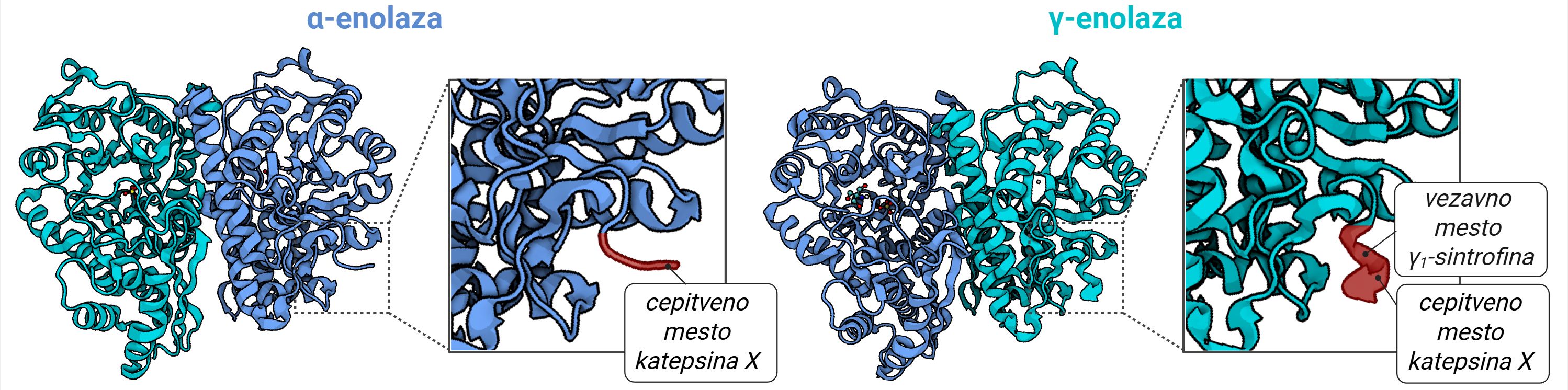Pri diferenciaciji oligodendrocitov in remielinizaciji imajo pomembno vlogo tudi nevrotrofični dejavniki, kot je možganski nevrotrofični dejavnik (angl. brain-derived neurotrophic factor, BDNF), ki prek receptorjev na površini celic spodbuja njihovo diferenciacijo 4. Med molekulami, ki izkazujejo nevrotrofično podporo, je tudi izooblika glikolitičnega encima enolaze – γ-enolaza. V možganih sesalcev obstajata dve obliki encima enolaze, in sicer α-enolaza (angl. α-enolase, ENO1), ki je prisotna v različnih vrstah celic, in γ-enolaza (angl. γ-enolase, ENO2), ki je značilna predvsem za nevronske celice (Slika 2). Med razvojem in diferenciacijo nevronov pride do spremembe v izražanju izooblik enolaze, pri čemer α-enolazo postopno zamenja γ-enolaza, ki prevzame pomembnejšo vlogo v specializiranih nevronskih funkcijah 5. Nevrotrofična aktivnost γ-enolaze izhaja iz njenega C-končnega dela, ki omogoča vezavo na ogrodni protein γ1-sintrofin in prenos encima k plazemski membrani 6, kjer γ-enolaza interagira s tirozin-kinaznim receptorjem, kar sproži signalne poti, ključne za preživetje in diferenciacijo celic 7. Trofično delovanje γ-enolaze je odvisno od ohranjenosti njenega C-končnega dela, ki je ključen za aktivacijo signalnih poti. Katepsin X (angl. cathepsin X, CTSX) encimsko cepi C-končni aminokislini in s tem zavira njen biološki učinek 8. Čeprav je vloga γ-enolaze pri razvoju nevronov dobro opredeljena, njen pomen v procesu diferenciacije oligodendrocitov in mehanizem uravnavanja s katepsinom X v teh celicah doslej nista bila podrobneje raziskana.