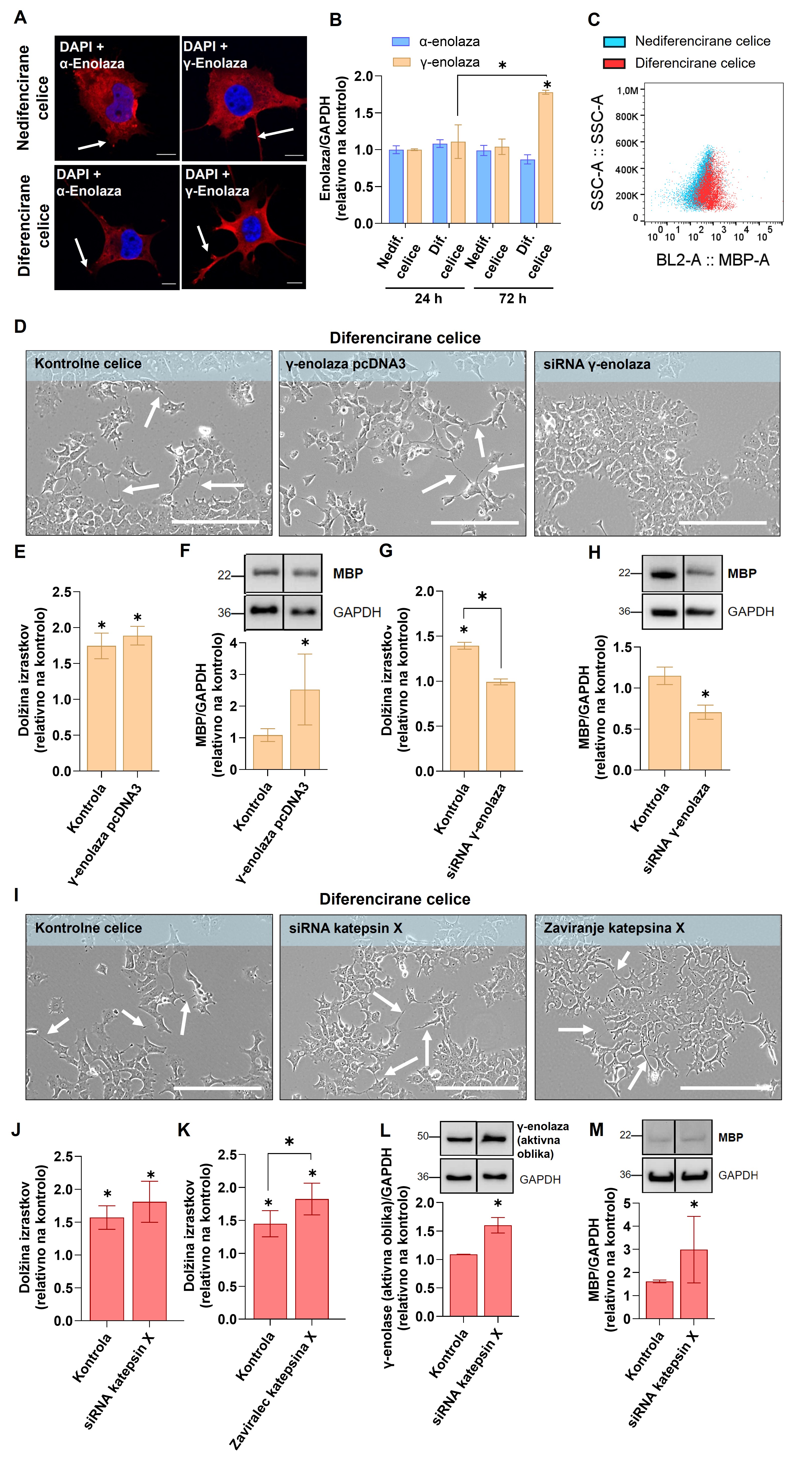 Poleg funkcionalne vloge γ-enolaze smo raziskali tudi mehanizme, ki uravnavajo njeno aktivnost. Znano je, da katepsin X cepi C-končni del γ-enolaze, kar prepreči njeno interakcijo z ogrodnim proteinom γ1-sintrofinom, potrebno za aktivacijo trofičnih signalnih poti 6. Z namenom preučitve vpliva katepsina X na uravnavanje γ-enolaze v diferenciranih oligodendrocitih smo njegovo delovanje zavrli z dvema pristopoma: z utišanjem izražanja s pomočjo male interferenčne RNA in z uporabo zaviralca proteolitične aktivnosti katepsina X. Morfološko analizo, izvedeno s svetlobno mikroskopijo, smo uporabili za oceno dolžine in razvejenosti celičnih izrastkov (Slika 3I), pri čemer smo v obeh primerih tudi kvantitativno potrdili njihovo izrazito podaljšanje (Slika 3J, 3K), kar je značilno za napredovalo diferenciacijo v mielinizirajoči fenotip. Poleg tega smo s pomočjo analize prenosa po westernu potrdili, da utišanje izražanja katepsina X vodi do povečane ravni aktivne, necepljene oblike γ-enolaze, kar dodatno potrjuje povezavo med delovanjem katepsina X in uravnavanjem aktivnosti γ-enolaze (Slika 3L). Hkrati je bilo zaznano tudi povišano izražanje MBP ob utišanem izražanju katepsina X (Slika 3M), kar dodatno potrjuje napredovanje oligodendrocitov v mielinizirajoče celice.