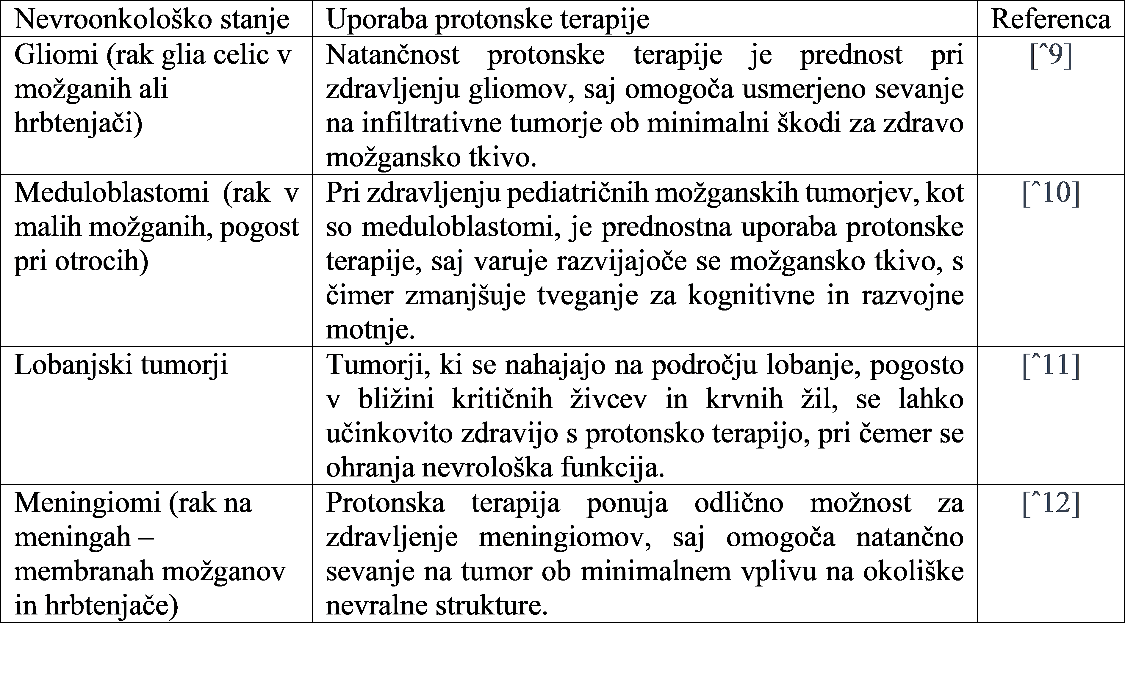 Protonska terapija je pokazala izjemno učinkovitost pri zdravljenju različnih nevro-onkoloških stanj, vključno z gliomi, meduloblastomi, lobanjskimi tumorji in meningiomi (Preglednica 1).