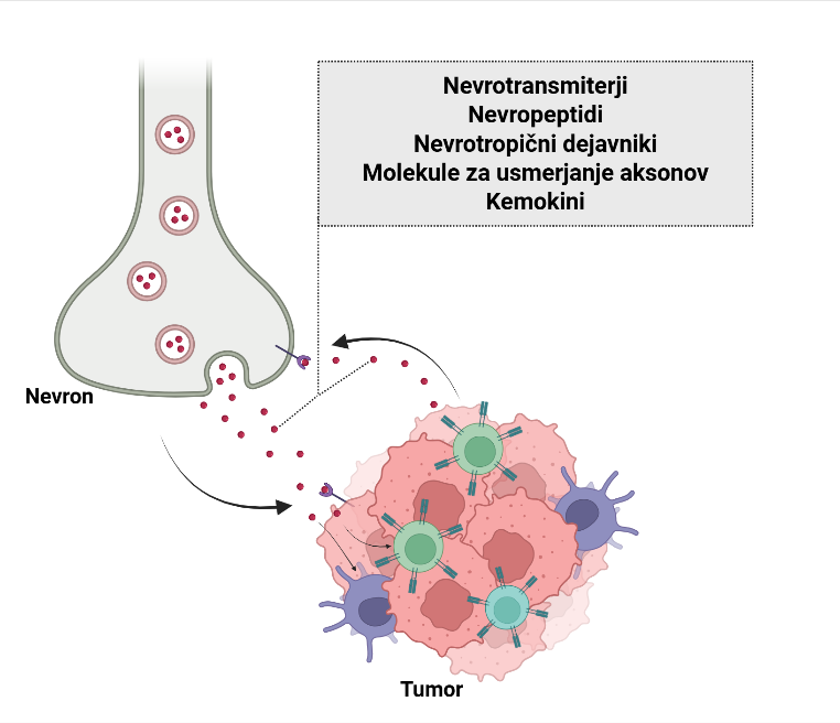 V zadnjem desetletju je prišlo do pomembnega premika v razumevanju vloge živčnega sistema pri raku, saj se je iz nekdaj pasivne, sekundarno prizadete strukture izkazal kot aktiven regulator tumorskega mikrookolja. S kompleksno dvosmerno komunikacijo med senzoričnimi, simpatičnimi in parasimpatičnimi živčnimi vlakni ter tumorskimi in imunskimi celicami vpliva na rast tumorja, imunski odziv, metastatske procese in odziv na zdravljenje. Sproščanje nevrotransmiterjev, nevropeptidov in rastnih dejavnikov iz živcev ter nevrotrofnih in vnetnih signalov iz tumorjev ustvarja povratne zanke, ki spodbujajo karcinogenezo in napredovanje bolezni. To je vodilo v razvoj novega interdisciplinarnega področja, nevrobiologije raka, ki odpira temelje za boljše razumevanje tumorske biologije in razvoj novih terapevtskih pristopov 1.