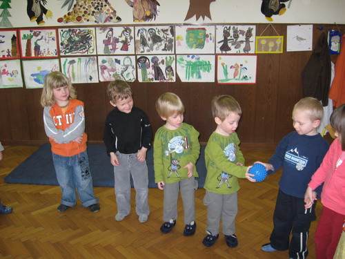 A začnimo na začetku. Čemu služijo možgani, kako delujejo, kako se prenašajo informacije, ponazorimo kar z gibanjem. »Možgani rečejo, naj Pia obriše nos, naj Brina brcne žogo, naj se Urša popraska po glavi,« … To je najbolj zanimiva igra, prenašanje informacije – žoge, od dela telesa v možgane in nazaj.
