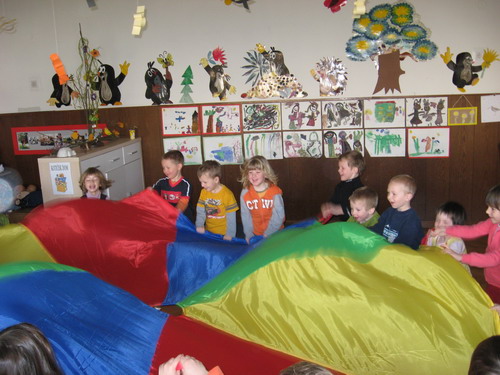 »Kaj pa so počeli možgani, ko so poslušali glasbo?« sprašujem otroke in že jim ponudim veliko barvno padalo.